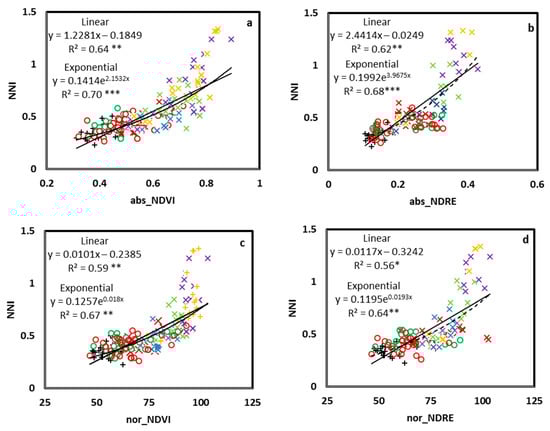 Relationship between the abs_NDVI (a) and abs_NDRE (b) values for all growing stages measurements together and the NNI (Nitrogen Nutritional Index) and the nor_NDVI (c) and nor_NDRE (d) values for all growing stage measurements together and the NNI. Two models were fitted: linear, solid line; exponential, dashed line. *, **, *** Significant at 0.05, 0.01 and 0.001 probability levels, respectively. +, 0N; ×, 40N + 0N; ×, 40N + 40N; ×, 40N + 80N; ×, 40N + 120N; ×, 40N + 160N; o, DS + 0N; o, SM + 0N. abs, absolute values; nor, normalized values; NDVI, Normalized Difference Vegetation Index; NDRE, Normalized Difference Red Edge Index.