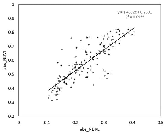 Relationship between the abs_NDVI and abs_NDRE values from the three growing seasons. abs, absolute values; nor, normalized values; NDVI, Normalized Difference Vegetation Index; NDRE, Normalized Difference Red Edge Index. **, significant at 0.01 probability level.