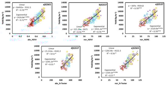 Relationship between the yield (kg ha−1) and abs_NDVI values at GS65 (a), nor_NDVI at GS37 (b), nor_NDRE at GS37 (c), abs_N-Tester at GS37 (d), and nor_N-Tester at GS65 (e). Two models were fitted: linear, solid line; exponential, dashed line. *, *** Significant at 0.05 and 0.001 probability levels, respectively. Initial fertilizers: ×, conventional; o, dairy slurry; ◊, sheep manure. N rate at GS30: red, +0N; blue, +40N; green, +80N; purple, +120N; orange, +160N. abs, absolute values; nor, normalized values; NDVI, Normalized Difference Vegetation Index; NDRE, Normalized Difference Red Edge Index.
