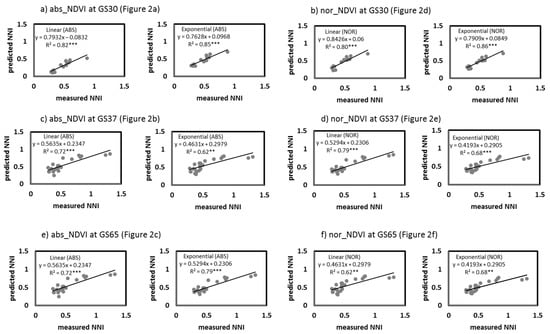 The correlations were fitted between the absolute and normalized CSR and NNI for each different growing stage (GS30, GS37, and GS65; Figure 2 and Figure 3), as well as a general correlation across growing stages (Figure 4). For growing stage-specific models, the RapidScan CS-45 indexes predicted a better NNI (Figure 2 and Figure 3) than the Yara N-TesterTM for both models (linear and exponential). The Yara N-TesterTM did not present a significant relationship to NNI, thus, relationships were not plotted. With RapidScan, the exponential models predicted the NNI more successfully than the linear models in all cases (a higher R2 and lower AIC and RMSE). For absolute values, the abs_NDVI values better explained the NNI variability (Figure 2a–c) than the abs_NDRE values (Figure 3a,b) in every growing stage (R2 values higher than 52 in all cases). The relationship between abs_NDRE at GS65 and the NNI was not significant, thus, it was no plotted. For the normalized values, the nor_NDRE (Figure 3d,e) values fit the NNI slightly better at GS37 and GS65 (R2 = 0.7) than the nor_NDVI values (Figure 2e,f). However, at GS30, nor_NDVI predicted the NNI better than nor_NDRE (Figure 2d and Figure 3c). The general model (Figure 4), especially the abs_NDVI values (Figure 4a), had good accuracy when estimating the NNI (R2 = 0.7, similar to the models for different growing stages). In the general model, there were no significant relationships between the Yara N-TesterTM and NNI, like that found in the growing stage-specific models (data not shown).