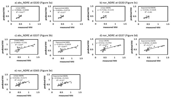 Relationships between the predicted NNI (Nitrogen Nutritional Index) values (from abs_NDRE at GS30 (a), nor_NDRE at GS30 (b), abs_NDRE at GS37(c), nor_NDRE at GS37 (d), and nor_NDRE at GS65 (e) values in the growing stage-specific models) and the measured NNI values from 25% of the samples. *, ** Significant at 0.05 and 0.01 probability levels, respectively. abs, absolute values; nor, normalized values; NDRE, Normalized Difference Red Edge Index.