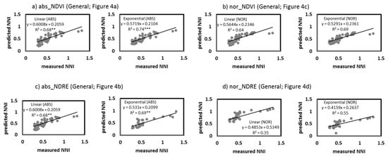 Relationships between the predicted NNI (Nitrogen Nutritional Index) values (from abs_NDVI (a) and nor_NDVI (b) and abs_NDRE (c) and nor_NDRE (d) values in the general models) and the measured NNI values from 25% of the samples. **,*** Significant at 0.01 and 0.001 probability levels, respectively. abs, absolute values; nor, normalized values; NDVI, Normalized Difference Vegetation Index; NDRE, Normalized Difference Red Edge Index.