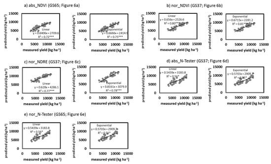 Correlation coefficients of the relationship between the absolute and normalized CSR at each different growing stage (GS30, GS37, and GS65) and grain yield (Figure 6) and GPC were fitted. The lineal models and exponential models predicted similar yields from CSR. The yield prediction capacity was high with abs_NDVI at GS65 (Figure 6a; R2 = 0.72), nor_NDVI at GS37 (Figure 6b; R2 = 0.76), and nor_NDRE at GS37 (Figure 6c; R2 = 0.70), whereas the yield prediction capacity with abs_N-Tester at GS37 (Figure 6d; R2 = 0.53) and that with nor_ N-Tester at GS65 (Figure 6e; R2 = 0.57) was low. The remaining relationships between yield and CSR (abs_NDVI at GS30 and GS37; abs_NDRE at GS30, GS37 and GS65; abs_N-Tester at GS30 and GS65) and nor_CSR (nor_NDVI at GS30 and GS65; nor_NDRE at GS30 and GS65; nor_N-Tester at GS30 and GS37) were not significant (data not shown). The GPC prediction capacity with CSR and that with nor_CSR was not significant in any of the cases (the best relationship was observed between abs_N-Tester at GS65 (R2 = 0.35)).
