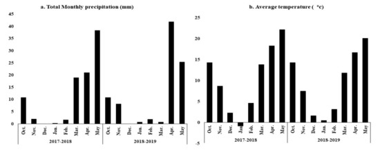 Meteorological data during both cropping seasons: (a) monthly precipitation, and (b) monthly average temperature.