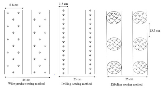 Schematic diagram of the wide precise sowing, drilling, and dibbling sowing methods.