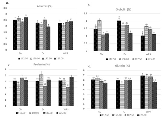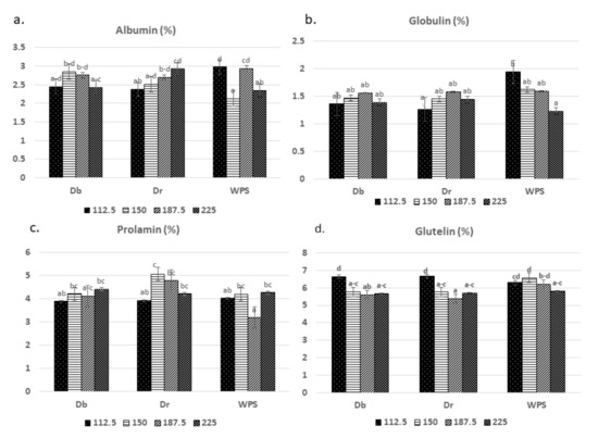 The effects of the sowing methods and seed rate on protein fractions in the second cropping season. (a–d) letters represent albumin (%), globulin (%), prolamin (%), and glutelin (%) respectively. Db, Dr, and Wps represent the sowing methods dibbling, drilling, and wide precise sowing, respectively. In summary, 112.5, 150, 187.5, and 225 represent the winter wheat (Xinong805) sown at 112.5 kg ha−1, 150 kg ha−1, 187.5 kg ha−1, and 225 kg ha−1, respectively. The vertical bars represent the standard errors (n = 3); in the same protein fraction, the same letters above the bars indicate no significant differences between the different treatments (p < 0.05).