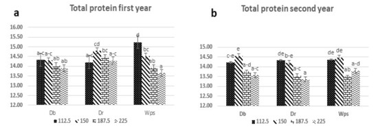 The seeding rate exerted significant influences on the total protein in both seasons. Broadly, a rise in the seed rate resulted in a total protein reduction in both years. The Db and Wps of the first season and Dr of the second season showed a clearer negative correlation between the seed rate and total protein, i.e., 112.5 kg ha−1 > 150 kg ha−1 > 187.5 kg ha−1 > 225 kg ha−1. In both cropping seasons (Figure 7), the lowest total protein was observed at the highest seed rate of 225 kg ha−1, except for the Wps in the second season, where the lowest total protein was noted at the SR at 187.5 kg ha−1, which was the lowest overall total protein in both years. The overall highest total protein in both seasons was noticed in first year in Wps, at 112.5 kg ha−1.