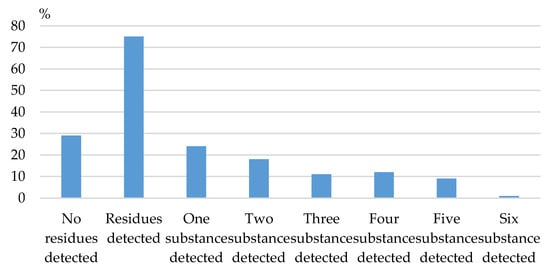 Among the samples in which pesticide residues were identified, the presence of a single such substance was detected in 24 samples. Residues of two or more pesticides were found in 51 samples (68%). The presence of two pesticides was noted in a total of 18 samples (24%), in 11 samples the presence of three pesticides was found (14.67%), and in 12 and nine samples, respectively, the presence of four and five pesticides was detected (16% and 12%). One of the analysed samples contained a combination of six identified compounds (Figure 1).