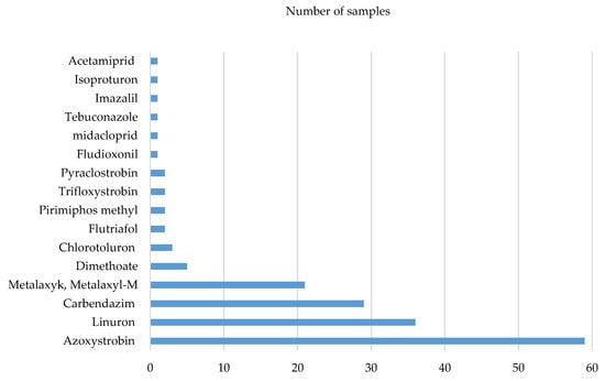 In the analysed samples the presence of residues of a total of 16 pesticides was detected. The most-frequently identified ones were azoxystrobin—detected in 59 samples (78.7%), linuron—assayed in 36 samples (48%), carbendazim—detected in 29 samples (38.7%), metalaxyl and metalaxyl M—found in 21 samples (28%) and dimethoate—detected in five samples (6.7%). The frequency of occurrence of the detected pesticides is presented in Figure 2. From among 250 compounds sought in the presented experiment, the presence of 16 pesticides (6.4%) was detected in the analysed samples, which means that no presence of 234 pesticides from the examined group of plant protection agents was found.