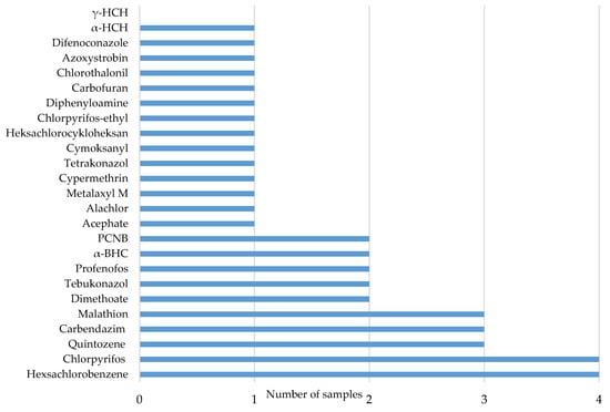 Numerical data contained in research reports concerning the observed presence of various pesticide residues in herbal samples is presented in Figure 3. Analysing the frequency of occurrence of the particular active substances in the analysed group of herbs, the most-frequently-detected pesticides were: hexachlorobenzene (16%), chlorpyrifos (16%), quintozene, (12%), carbendazim (12%), malathion (12%), dimethoate (8%), tebuconazole (8%), profenos (8%), benzene hexachloride—α-BHC (8%) and pentachloronitrobenzene—PCNB (8%). Two of those—carbendazim and dimethoate—were also among the most-frequently-identified pesticides in the presented study—Figure 2.