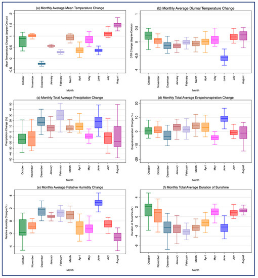 Projected changes in (a) monthly mean temperature (Tmean; °C), (b) monthly average diurnal temperature range (DTR; °C), (c) monthly average total precipitation amount (Pr; %), (d) monthly average total actual evapotranspiration (AET; %), (e) monthly average relative humidity (RH; %), and (f) monthly average total duration of sunshine (SunD; hr) under RCP8.5 scenario for the period of 2021–2050 with respect to the period of 1991–2012, using dynamically downscaled model outputs.