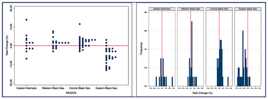 Spatial distribution of percentage changes in yield. On the left, the values on the vertical axis are the percentage changes, whereas the navy-blue dots represent each location within the related region given on the horizontal axis. On the right, the relationship between the number of locations and the percentage ranges of the regional changes are illustrated.