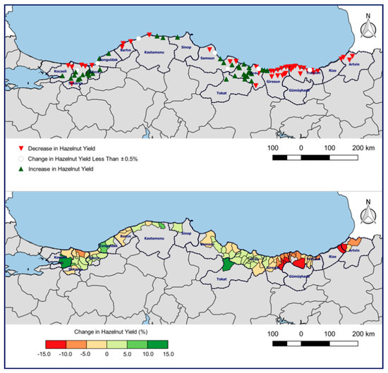 Hazelnut yield per area and per tree in Turkey is lower compared to other countries [32,72], which may be a result of management and technology options. Moreover, in the 2021–2050 future period with respect to the 1991–2012 reference period, the results indicate that changes in hazelnut yield may be increased (up to 14%) or decreased (up to 13%) depending on location. The majority of the decrease is expected to be in the eastern Black Sea sub-region, which is the most important area of Turkey in terms of high-quality hazelnut production. Particularly due to the aging of hazelnut trees, the yield of quality hazelnuts may decrease even more in the mid and distant future in the eastern Black Sea sub-region where the yield is already lower compared to the central Black Sea, the western Black Sea and the eastern Marmara sub-regions.