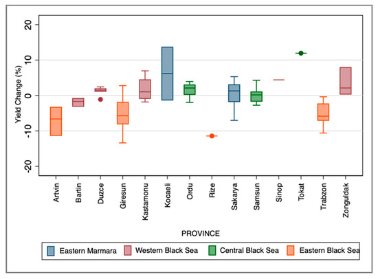 Projected yield change by province is illustrated in Figure 6. Hence, Ordu, which has the highest hazelnut production, is predicted to have an increase of 1% to 4% in 14 locations and a decrease of 1–2% in 3 out of 19 locations. The projection results show that climate change is more likely to affect hazelnut yield in Giresun (eastern Black Sea), with a wider range between −13% to 3%. In 6 locations of Sakarya (western Black Sea), hazelnut yield will rise by 1–5%, while 4 locations have a decrease by 1–7%. In Düzce (western Black Sea), one of the most important cities for hazelnut production after Ordu, Giresun, and Sakarya, an increase with a range of 1–2% is predicted in all locations except Akçakoca. A decrease of up to 11% is projected in all locations (12 locations in total) of Trabzon.