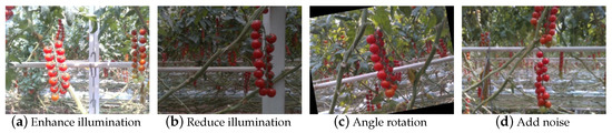 To make the model more robust, data augmentation techniques for all the number of original images were applied with the methods of rotating, brightness adjustment and noising. Considering the randomness of growth stages of cherry tomatoes, images were augmented with rotations of ±5, ±10. After data augmentation, the number of image samples was expanded to 3460. Examples of data augment images are shown in Figure 2.