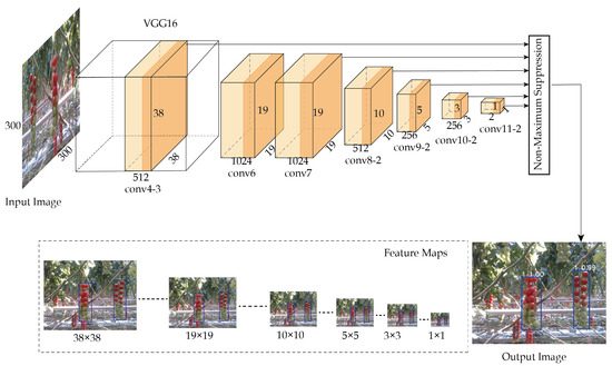 The structure of the SSD model is shown in Figure 3. VGG16 was used as the base network of SSD. Several layers were added to the end of the base network. During training, image and the corresponding Ground-Truth Box were inputted at the same time. A default box set and the confidence of object category in box were subsequently generated by each feature map in 6 layers.
