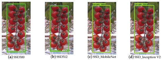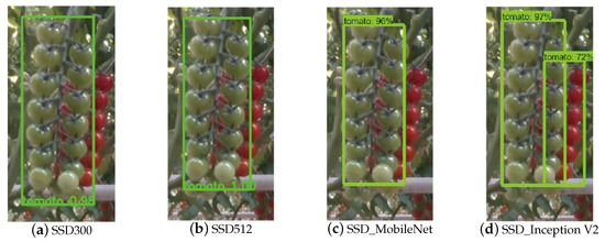 The detection results of side-grown cherry tomatoes. (a) the result of SSD300 model, (b) the result of SSD512 model, (c) the result of SSD_MobileNet model and (d) the result of SSD_Inception V2 model.