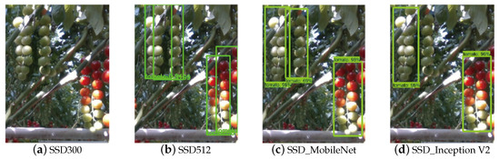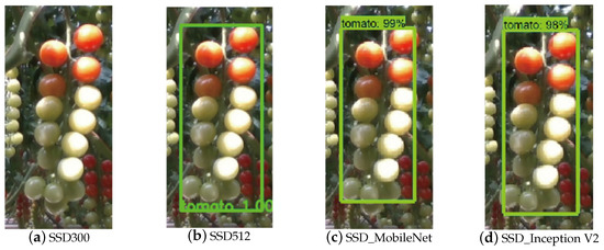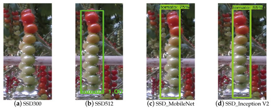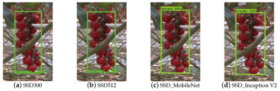 Some examples of cherry tomatoes with uneven illumination are shown in Figure 7. Some fruit surfaces have white spots due to excessively strong illumination. Except for the SSD300 missed detection, the other three models are correctly detected tomatoes. The IOU of four different models were 0, 0.913, 0.735 and 0.921 respectively. It reveals that SSD_Inception V2 model has the best performance.