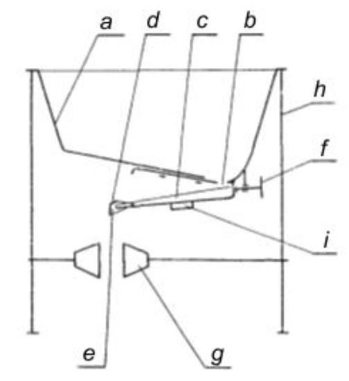 Light treatment device: a—hopper, b—outlet, c—chute, d—adjustable element, e—gap, f—adjustment screw, g—halogen floodlights, h—cover, i—vibration actuator.