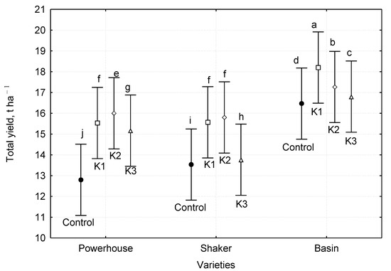 —Total and marketable leafless corn cobs yield (t·ha−1) according to the norm PN-R75377: 1996 [21],