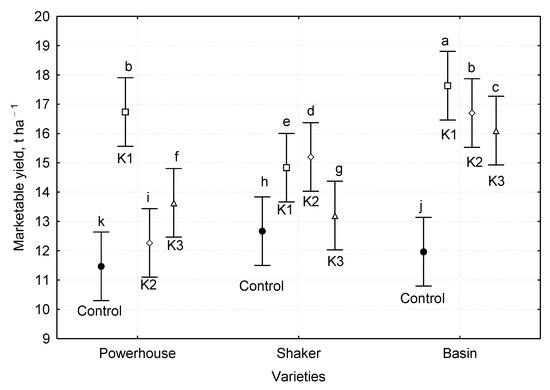 After the applied red light treatment, an increase was observed in the corn kernel content corresponding to marketable yield for all cultivars relative to the control (Figure 3). The highest marketable yields were obtained after K1 treatment for Powerhouse (45%) and Basin (48%) cultivars, and after K2 treatment for Shaker plants (20%)—compared to the control. In turn, the lowest yield increase was observed after K2 treatment for Powerhouse (6%) and after K3 treatment for Basin (36%) and Shaker (4%) plants.
