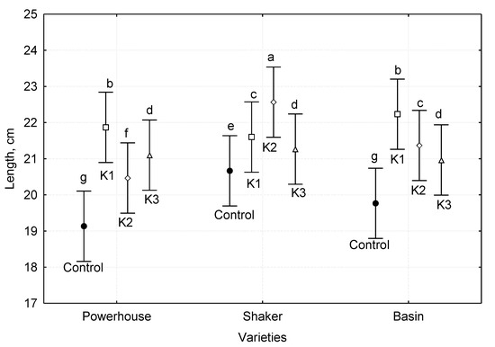 Under the influence of the applied of light with seeds, changes in the length of the cobs were found in all varieties relative to the control (Figure 4). At K1, an increase of 14.3% for Powerhouse, 12% for Basin, and 4.9% for Shaker was observed. On the other hand, with K2 for the Powerhouse, Shaker, and Basin varieties, by approx. 6.9%, 9.6%, and 8.1%, respectively, and with K3 by approx. 10.3%, 3.2%, and 6.1%, respectively.