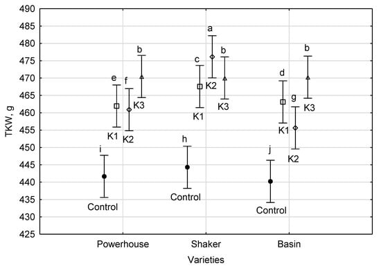 The TKW was similar for all three cultivars analyzed. After 3-time light exposure, the weight was roughly the same, approx. 470 g. For two of the cultivars, Powerhouse and Basin, this was the highest value obtained. In the case of Shaker plants, the best effect was recorded for the K2 treatment.