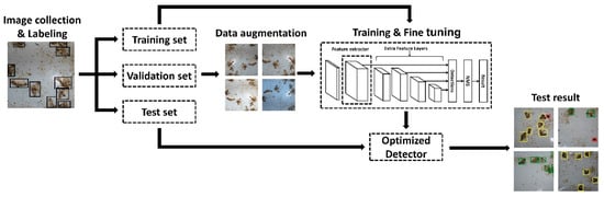 Training numerous parameters of deep neural networks requires a large amount and diversity of training data. For this reason, data augmentation methods are used to increase the amount and diversity of data by artificially modulating training images. In this study, we employed data augmentation methods to obtain more robust detectors during the training process. Horizontal and vertical flipping, contrast and brightness adjustment, color distortion, random cropping, and 90º rotation were applied to the training process. Each augmentation method was applied with a 50% probability when the data repeatedly entered the detectors. The collected image dataset was divided into train set for training, validation set for detector optimization, and test set for performance evaluation, as shown in Table 1.