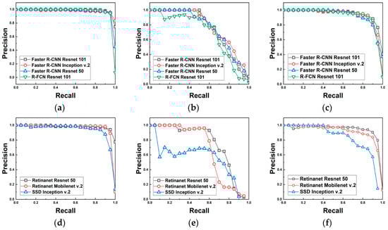 Precision-Recall(PR) curve of trained detectors: (a) Faster R-CNN based models and R-FCN model for Spodoptera litura moth; (b) Faster R-CNN based models and R-FCN model for Helicoverpa assulta moth; (c) Faster R-CNN based models and R-FCN model for Spodoptera exigua moth; (d) SSD-based models for Spodoptera litura moth; (e) SSD-based models for Helicoverpa assulta moth; (f) SSD-based models for Spodoptera exigua moth.