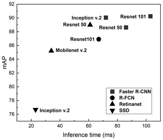 Mean average precision (mAP)-Inference time plot for trained detectors.