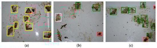 Moth detection results of Faster R-CNN ResNet 101 detector with a confidence score threshold of 50%: (a) Spodoptera litura (yellow box) and unknown insect (red box); (b) Helicoverpa assulta (white box) and unknown insect (red box); (c) Spodoptera exigua (green box) and unknown insects (red box).
