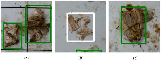 Pheromone trap images have a simpler background than ordinary images and do not contain various objects. Therefore, there is a lack of difficult negative samples when training and there is a high possibility of false detection when an object not included in the training exists in the image. In this study, insects other than the target moths in the trap image were classified as an unknown class. As shown in Figure 4, 168 photos containing various insects were added to the dataset so that non-target insects could be detected as unknown class when they were included in the collected image.