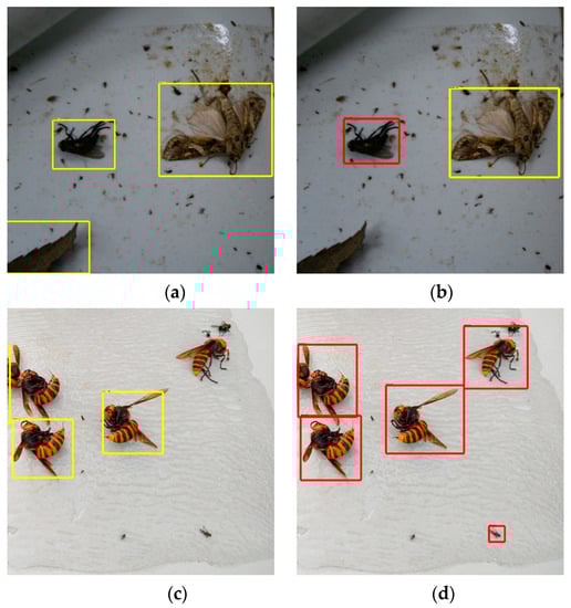 Table 3 shows the comparison results of the detector with and without the images of the unknown class. For comparison of average precision in the same test set, a test set was constructed with only target moth data images excluding unknown class images. Although new class (unknown class) was added on the model and only moth trap images were tested, there was improvement in mean average precision. Figure 9 shows the detection result images of the three-class and four-class detectors. Comparing Figure 9a,b, which are the result images of the three-class and four-class detectors, respectively, the fly that was confused with the moth in the three-class detector was correctly classified as an unknown class in the four-class detector. In addition, the leaf that was incorrectly detected as a moth in the three-class detector was not detected as a moth in the four-class detector. The moth trap image set used for the comparison of the three and four class models did not contain many other insects or objects, so there was no significant difference in the average precision value. However, when data other than moth trap data was input, the error of the three class detector increased as shown in Figure 9c. In Figure 9c, the three-class detector incorrectly detected wasps as the moth. However, in Figure 9d, the result of the four-class detector, wasps were detected as unknown class without being confused with the moth. As shown in Table 3, the average precision of the Faster R-CNN ResNet 101 detectors for three target moth species with and without the image of an unknown class (three-class and four-class detectors) was not significantly improved. However, the four-class model with the images of unknown class successfully detected non-moth objects and showed stable detection results when objects other than moths were included in the image shown in Figure 9.