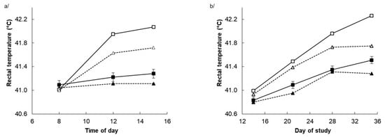 Heat stress increased rectal temperature (p < 0.001) with the response being greatest (p < 0.001) during the afternoon when ambient temperature was highest (Figure 1a) and towards the end of the experiment (Figure 1b). Dietary BET decreased rectal temperature (p < 0.001) with the response being greatest in those chickens exposed to HS, during the afternoon when the temperature was highest (Figure 1a) and towards the end of the experiment (Figure 1b) as indicated by TM × D (p < 0.001), T × D (p < 0.001) and T × TM × D (p < 0.001) interactions. Consequently, on the afternoon of day 34 of age HS increased rectal temperature by 1.1 °C in the CON (41.6 vs. 42.7 °C), whereas the BET diet had a rectal temperature of only 41.0 °C during HS (Table 2). Respiration rate on day 34 was increased by HS (64.0 vs. 160 bpm, p < 0.001), and was decreased in BET (122 vs. 102 bpm, p = 0.004) (Table 2). However, there was a T × D interaction (p = 0.017) such that the increase in respiration rate in response to HS was greater in the CON (66.0 vs. 177 bpm) than in the BET (62.0 vs. 142 bpm) (Table 3).