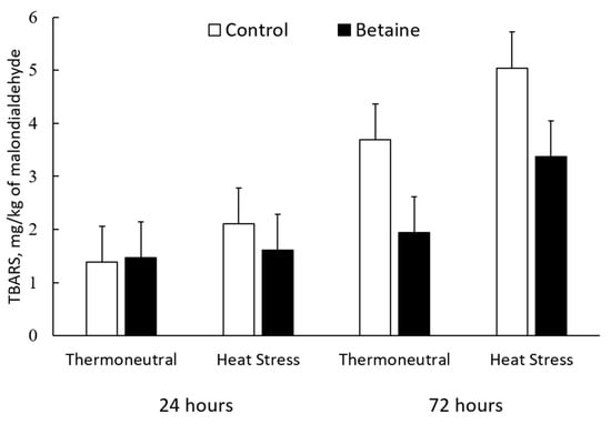 Breast muscle TBARS increased between 24 h and 72 h post-slaughter (1.64 vs. 3.06 mg/kg, p < 0.001), was increased by HS (2.12 vs. 3.03 mg/kg, p = 0.017) and was decreased by BET (3.06 vs. 2.10 mg/kg, p = 0.008) (Figure 2). There was an interaction between time post-slaughter and BET (p = 0.036) such that BET decreased TBARS to a greater extent after 72 h (4.37 vs. 2.66 mg/kg) than at 24 h (1.74 vs. 1.54 mg/kg) post-slaughter (Figure 2).