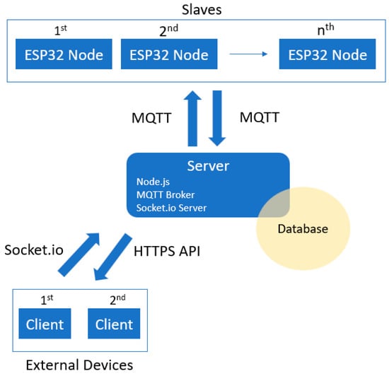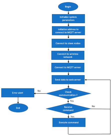MQTT (Message Queuing Telemetry Transport) is a publish/subscribe protocol in IoT devices, which has low bandwidth, high reliability, and two directions, and is compatible with almost operating systems. The network communication was built as in [51], in which numerous clients can be associated to the server—named as MQTT broker in Figure 1. Every client registers their individual channel and publishes information; subscribed activity is considered as registration. The database is categorized into messages: Control and feedback. The server transmits a control command, received from external units, to the slave nodes. The feedback frame, including the node status and the acknowledge response, is transmitted back to server from the slave nodes. Using this protocol network, the system can prevent data loss during message transmission.