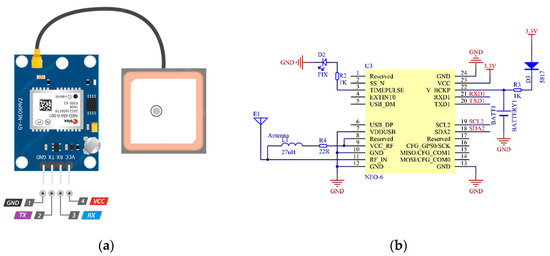 Module of GPS NEO-6M V2: (a) Connection scheme [52]; (b) hardware schematic [53].