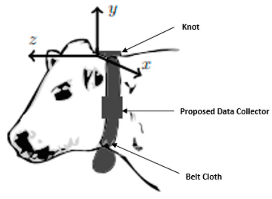 The hardware set-up on the forehead of cattle is illustrated in Figure 9. First and foremost, the equipment is placed near the animal’s mouth to acquire better information. For the animal’s comfort, a knot helps farmers to tie the device appropriately at various dimensions. The material of the belt should be soft, easy to disassemble, and, especially, evaporative for water to come out. In this position, the motion of the jaw can be documented exactly and effectively.