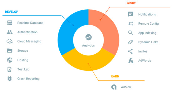 Firebase is a mobile and web application development platform developed by Firebase, Inc. in 2011, later acquired by Google in 2014 [59]. Several services—for instance, develop, grow, or earn—have been introduced, as shown in Figure 10. Several noticed functions of Google Firebase are explained below.