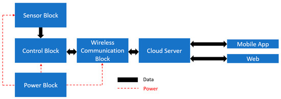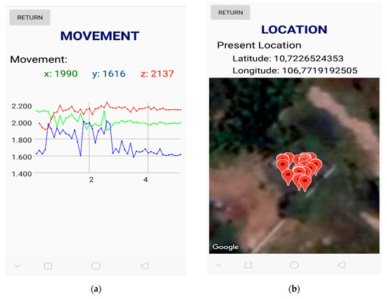 Firstly, the firmware (as shown in Figure 11) is programmed in micro-controller CPU by Arduino IDE. In the main loop, a series of commands that read values from the sensor block are written before interfacing with the wireless communication. API functions in the libraries are provided for hardware access. Note that the pin mode has to register correctly in order to match the configurations. As the battery often reduces the voltage capacity according to time, a voltage regulator is used to preserve the power level, which, for Firebase, plays the role of cloud server to store data via the wireless network. A large amount of data (i.e., position, motion, sound, temperature) requires rapid transmission and reliable storage in the host server. On pocket devices, the Android-based application, developed by Android Studio, displays the monitoring data; the illustration comprises graphical data and recent records that reflect most outdoor activities. On personal computers, a web page is also established to visualize the data.