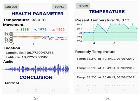 After attaching the device to the animal, an operator can view the received data directly on a mobile phone. This allows configuring the network constraints, enabling machine and filling in the IP address of the server, and inserting the appropriate password (if the user is authorized to do so), after which, the well-being parameters shortly appear on the main Graphical User Interface (GUI), as shown in Figure 13a. Once received from the cloud console, the data are automatically logged to both the dashboards and the data buckets for remote management and automated control via electronic consumer devices. On the main screen, general information is briefly displayed for the user. Each category of received data has an average value, and maximum and minimum thresholds. In the case that the current rate fluctuates far from these thresholds, the fitness status (i.e., the “conclusion”) changes to abnormal to alert the farmer. Otherwise, a normal message is returned to the user. In the second configuration (Figure 13b), the temperature information is updated every ten minutes and its graph helps farmers to visualize temperature variations. When the system was being tested, a digital sensing meter was connected to each of the points of interest to measure the actual values.