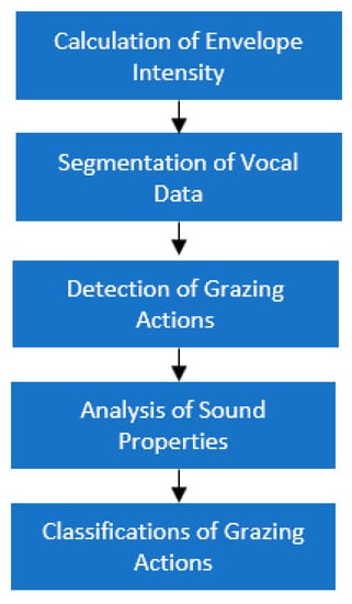 Information on outdoor events is not enough to determine an animal’s health status. A novel data collector, including vocal materials from feeding activities, is necessary to ensure accurate monitoring. From the data obtained using an open-source data collector, stockbreeders can (a) recognize which grass is suitable for their livestock, (b) determine the eating habits of their cattle via advanced analysis, and (c) classify ingestive behaviors. The data resource in the records from the proposed instrument is available online in [64]. In this test, we tried to analyze this sample to verify the correctness and feasibility of our approach. It is considered that our signals correspond to the chew, composite chew–bite, and a bite actions of livestock [27]. For implementation targets, the completion of feature extractions can be done as a set of five successive stages, as shown in Figure 18.