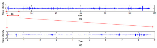 Signals recorded by the proposed data collector: (a) Original sound signal; (b) resampled sound signal.