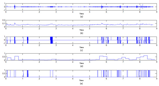 Flow example of a 10 s soundtrack with correspondent signals achieved by the proposed data collector: (a) A down-sampled sound signal; (b) envelope magnitude; (c) slope sign; (d) maximum amplitude; (e) duration of detection.