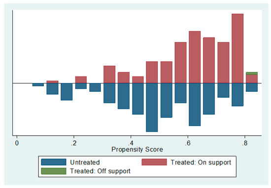 The PSM common support or overlap and distribution of the treated and untreated based on the propensity score technique is shown in Figure 1. Those farmers not growing any cash crops are considered to be the nonadopters, and those growing cash crops are the adopters. Figure 1 indicates the distribution among treatment units and comparison units across each point of the propensity score.