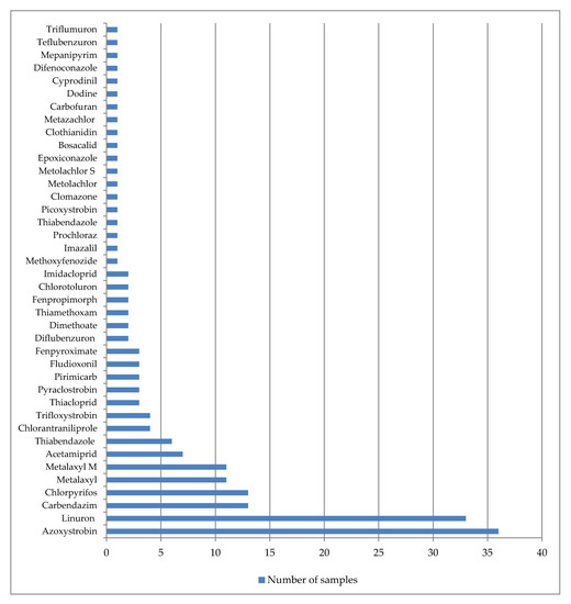 In the analysed samples, a total of residues of 40 pesticides were identified. The most often identified ones were azoxystrobin—detected in 36 samples (22.5%), linuron—assayed in 33 samples (20.6%), chlorpyrifos and carbendazim—each detected in 13 samples (8.1%), metalaxyl and metalaxyl M—in 11 samples (6.9%), and acetamiprid—in 7 samples (4.4%). The frequency of occurrence of all identified pesticides is presented in Figure 1. From among the 250 compounds sought in the presented experiment, in the analysed samples, the presence of 40 pesticides was found, which means that no presence of 210 pesticides from the estimated group of plant protection agents was detected. In terms of the use of the marked substances, they were classified into groups: fungicides (47.5%), insecticides (32.5%), herbicides (15%), carbamates (2.5%), and organophosphorus pesticides (2.5%). In the presented research, all identified pesticide residues are authorised in Poland. All pesticides found in individual products of plant origin are dedicated to the protection of a given plant species.