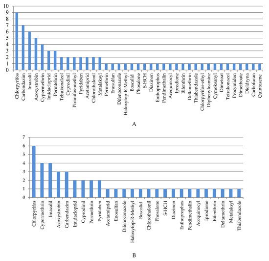 The most frequently detected pesticide residues in samples of plant origin according to literature data, (A) in all samples, (B) in fruit and vegetable samples (literature reports in Table 3).