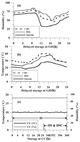 Temperature and humidity status for the delayed storage (DS) and delayed storage under cover (DSC)-treated tomatoes (a,b) during 24 h delayed cooling in the greenhouse (GH) and inside the controlled chamber (CC) for immediate storage (IS), DS, and DSC-treated tomatoes (c).