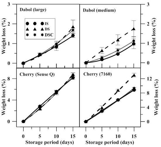 Changes in weight loss of four tomato cultivars over 15 days of storage under IS (immediate storage), DS (storage delayed 24 h), and DSC (storage delayed 24 h under cover) postharvest treatments.