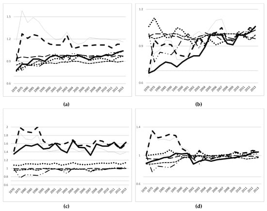 Since we examine the differences and changes in TFP and its finer components across 104 countries over 45 years, technological heterogeneity across countries and over time is an important issue. Alvarez and del Corral [46] criticized the popular trend in the literature which assumes homogenous technology for all the producers, and applied a latent class model approach to empirically prove that such simplified assumptions result in biased estimates. Similarly, Cillero applied a latent class model to investigate the consequences of differences in production technology on Irish beef farms [47], whereas few studies have applied random parameter models [48,49]. A very similar one to ours is the work of Baráth and Fertő [50], who applied O’Donnell’s FPI index framework and estimated TFP parameters and convergence to European agriculture. In the process, to acknowledge the productivity consequences of technological heterogeneity across European farms, the authors applied a cluster analysis. However, a cluster analysis requires additional information about farm production environments and weather conditions for grouping [50]. Since we are dealing with large number of countries covering a long period, gathering such information was difficult, and even after admitting the importance of technological heterogeneity, we had to proceed with the assumption of homogenous technology. However, further research acknowledging technological heterogeneity will provide more in-depth understanding of TFP dynamics.